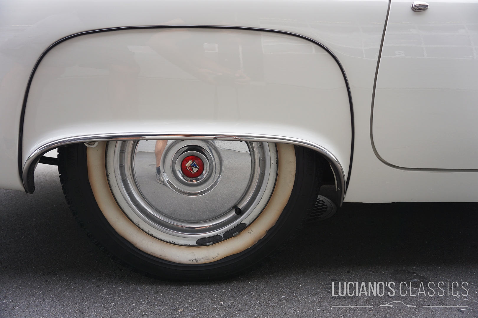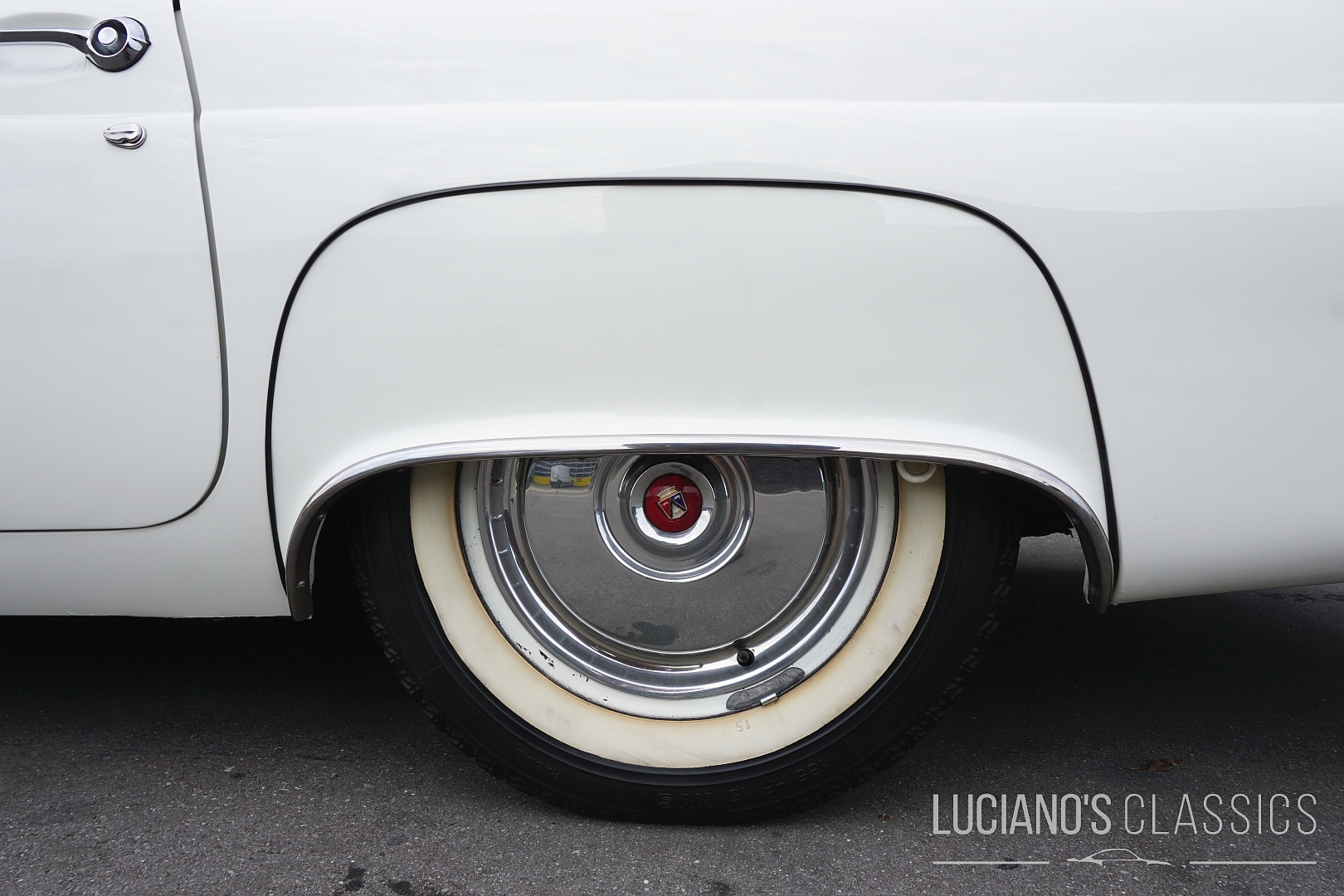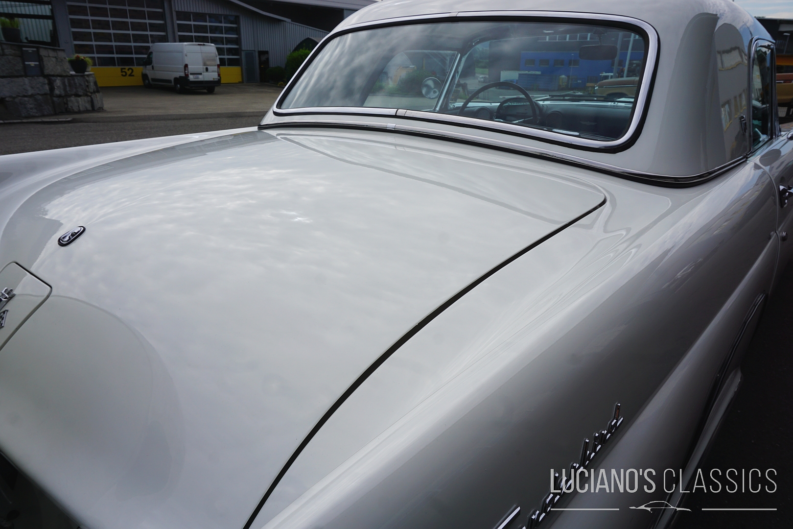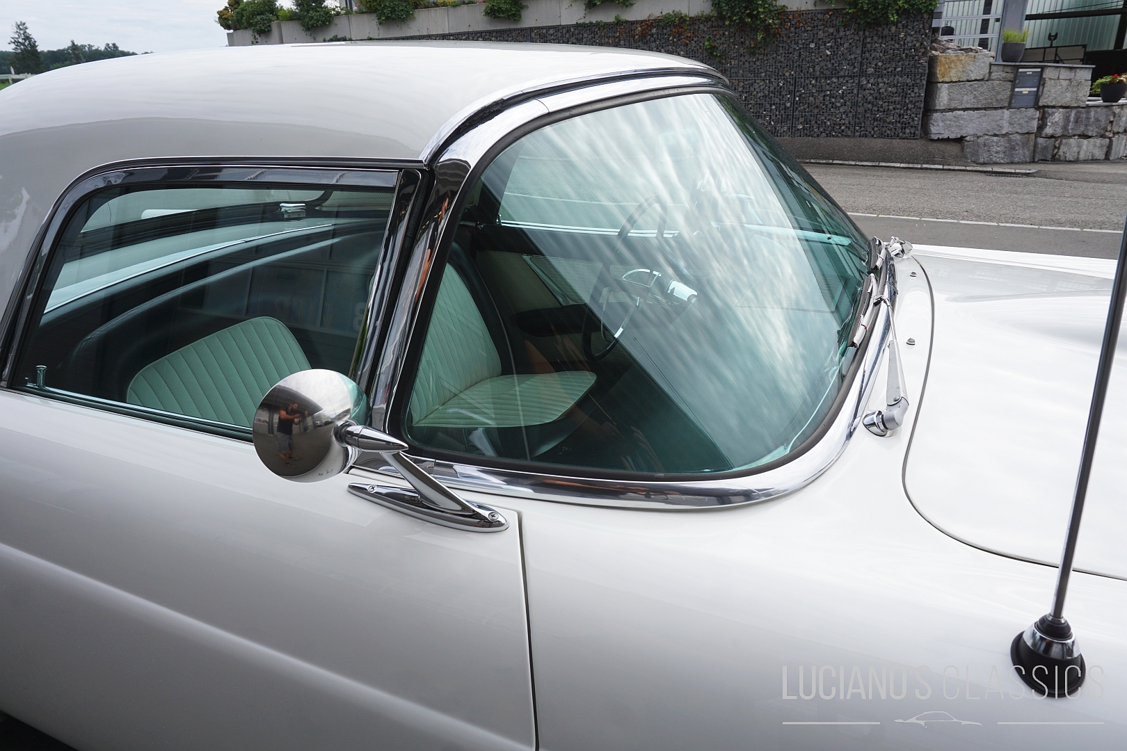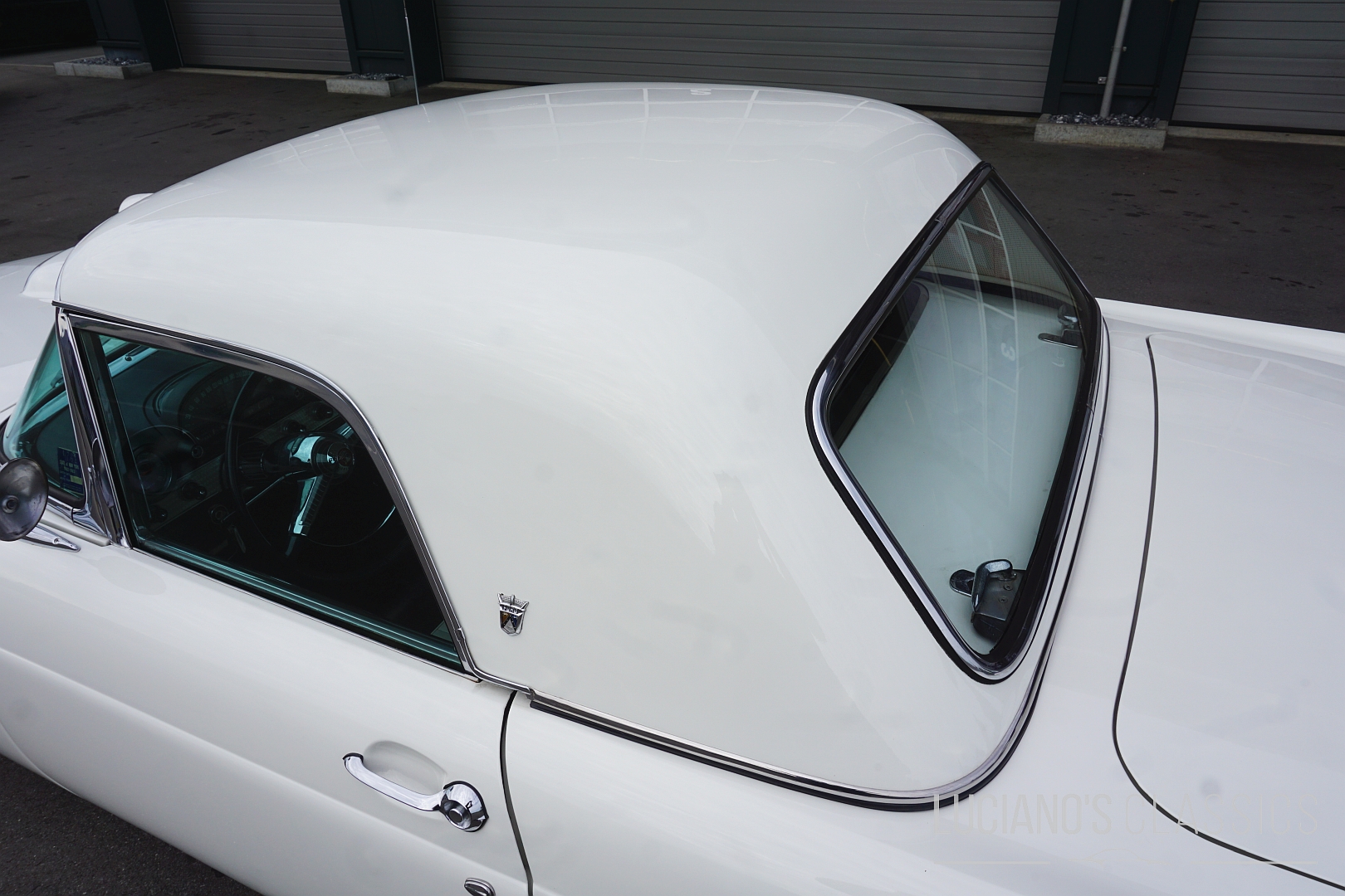 Der Wagen besticht durch seine elegante Zweitürer-Linie, mit dem typischem, abnehmbarem Hardtop, den Radhausabdeckungen und den charakteristischen Flügeln am Heck. Die Lackierung in klassischem Weiss harmoniert perfekt mit dem chromverzierten Interieur das stilgerecht restauriert wurde. Jeder Hebel und jedes Detail atmet den Spirit der Fifties.